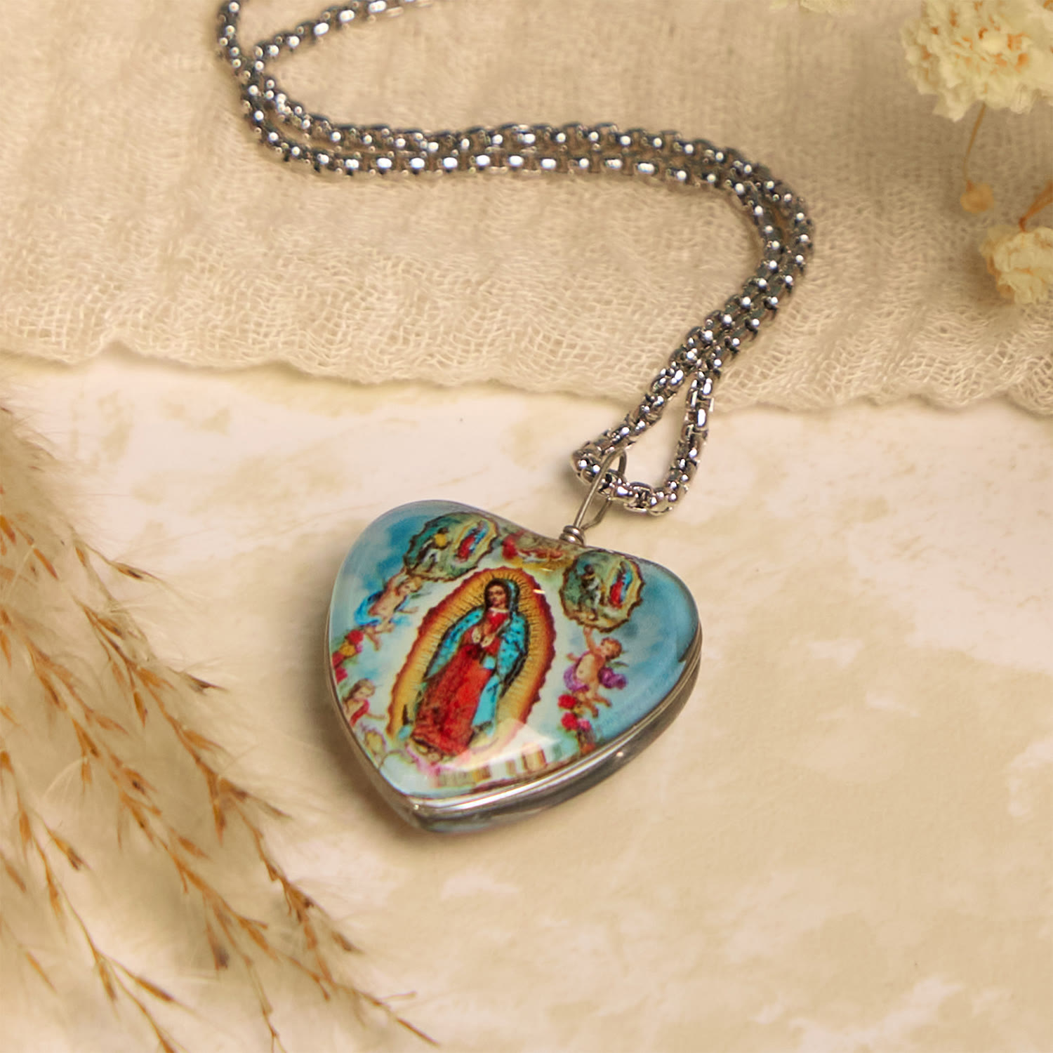 Handmade resin heart holds the Virgin Mary's image. glowing softly in darkness—reminding of her constant watch. Durable silver chain ensures daily wear. merging style and spirituality. -