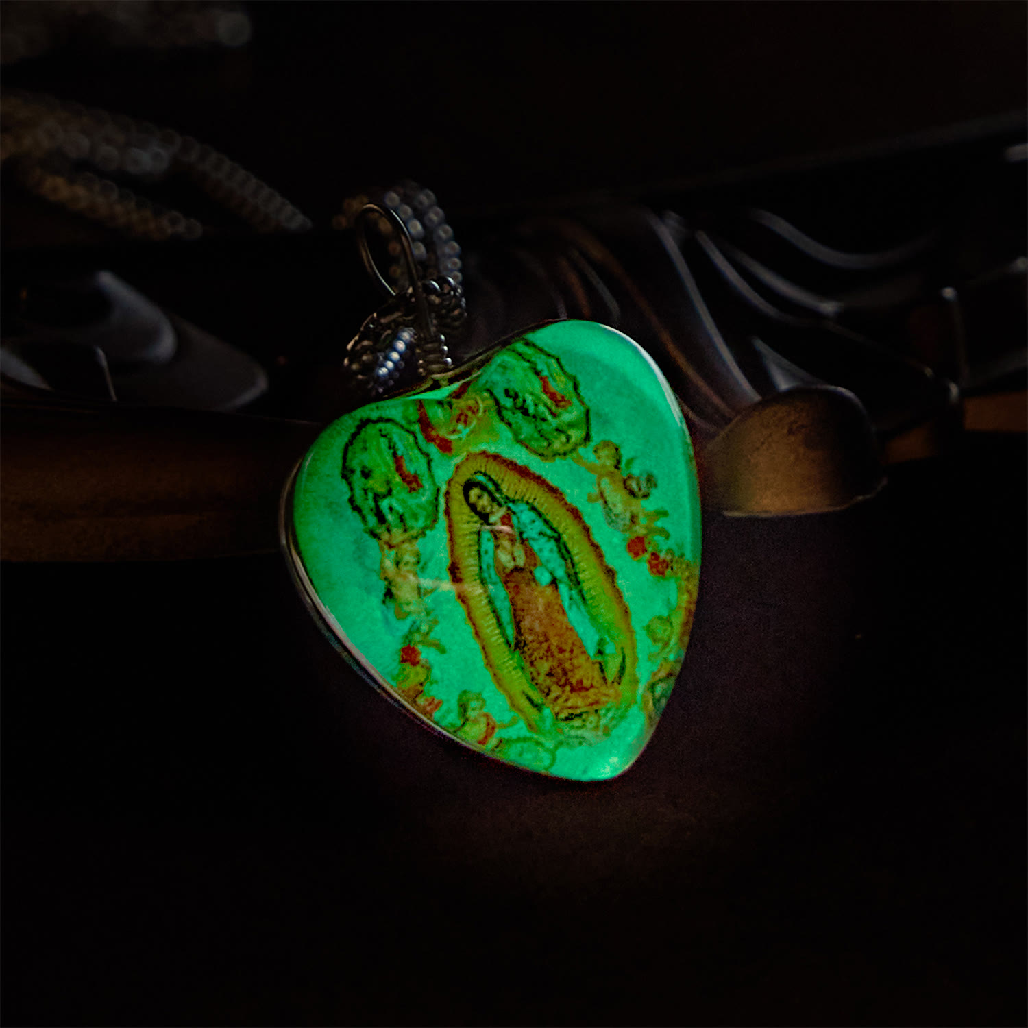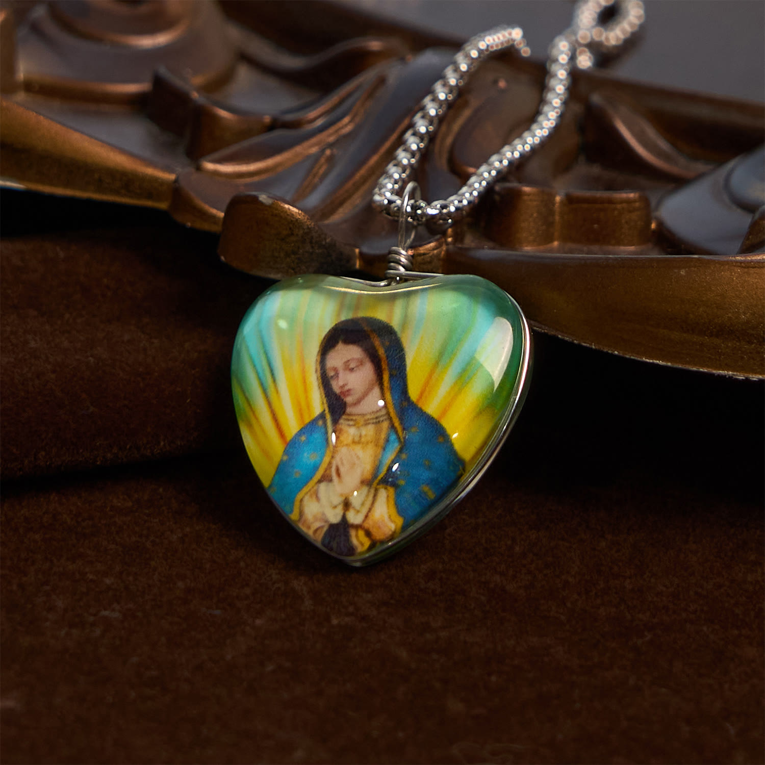 The glow-in-the-dark Heart Shaped Resin Medal Necklace. featuring the Virgin Mary. blends faith with a unique luminous design. A symbol of silent. ever-present blessings. -